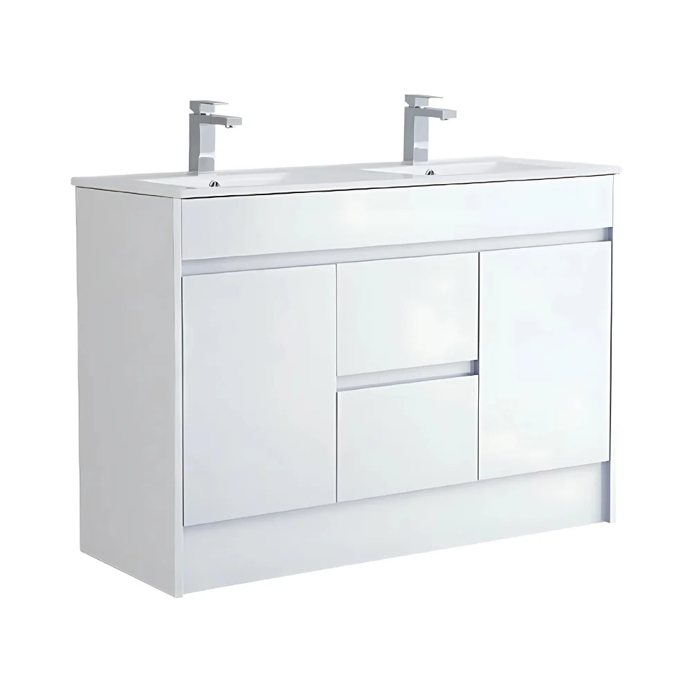 The Stockholm floor standing basin unit is unique in design (Two soft closing drawers located in the middle of two soft closing doors), complete with a one tap hole single designer ceramic basin.